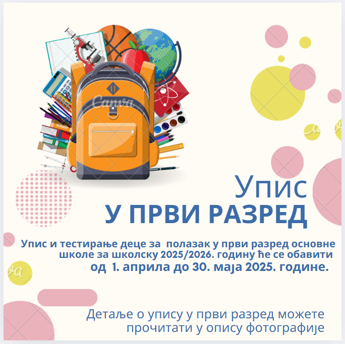 Упис и тестирање деце за полазак у први разред основне школе за школску 2025/2026. годину ће се обавити у периоду од 1. 4. 2025. до 30. 5. 2025. (у изузетним случајевима и до 31. 8. 2025. године).